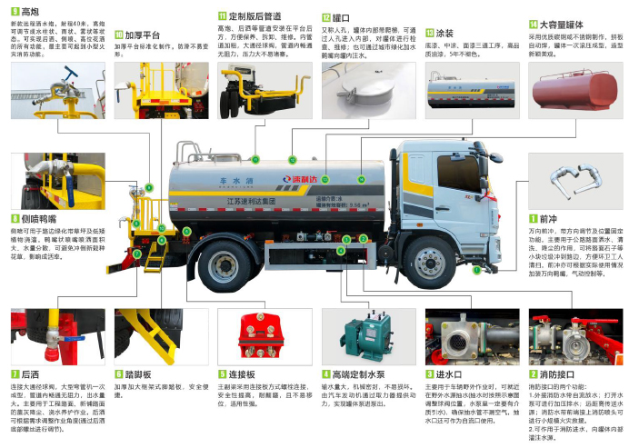 ● 采用專用定制版大功率水泵,具有性能優(yōu)良、工作可靠、效率高、流量大、等特點(diǎn),前沖可達(dá)雙向8車道,后灑可達(dá)雙向4車道,高炮最大可達(dá)40米射程。